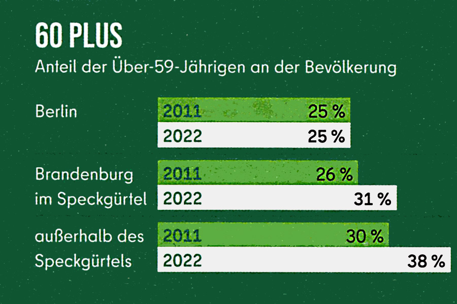 Im Vergleich zu den Flächenländern ist Berlin als Stadtstaat noch ein "junges" Bundesland. Der beständige Zuzug federt die demografische Entwicklung ab. Das wird besonders deutlich, wenn Berlin mit seinem Umfeld betrachtet wird.