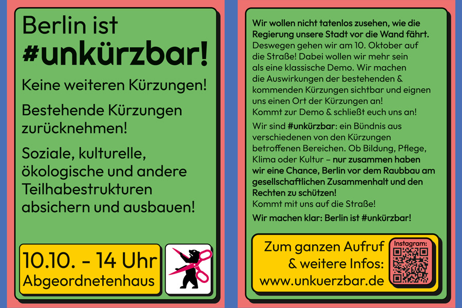 Berlin steht vor einer entscheidenden Weichenstellung: Der Doppelhaushalt 2026/27 wird gerade verhandelt und soll im Dezember beschlossen werden. Während sich die Regierung für einen „Rekordhaushalt“ von 43,8 Milliarden Euro feiert, ist dieser für uns nichts weiter als ein schlechter Witz. Sämtliche Kürzungen bleiben bestehen und neue sind bereits beschlossen. Und wo wird mal wieder am meisten gespart? Bei der sozialen Daseinsvorsorge – der Grundlage für unser Zusammenleben und das, was Berlin lebenswert macht!